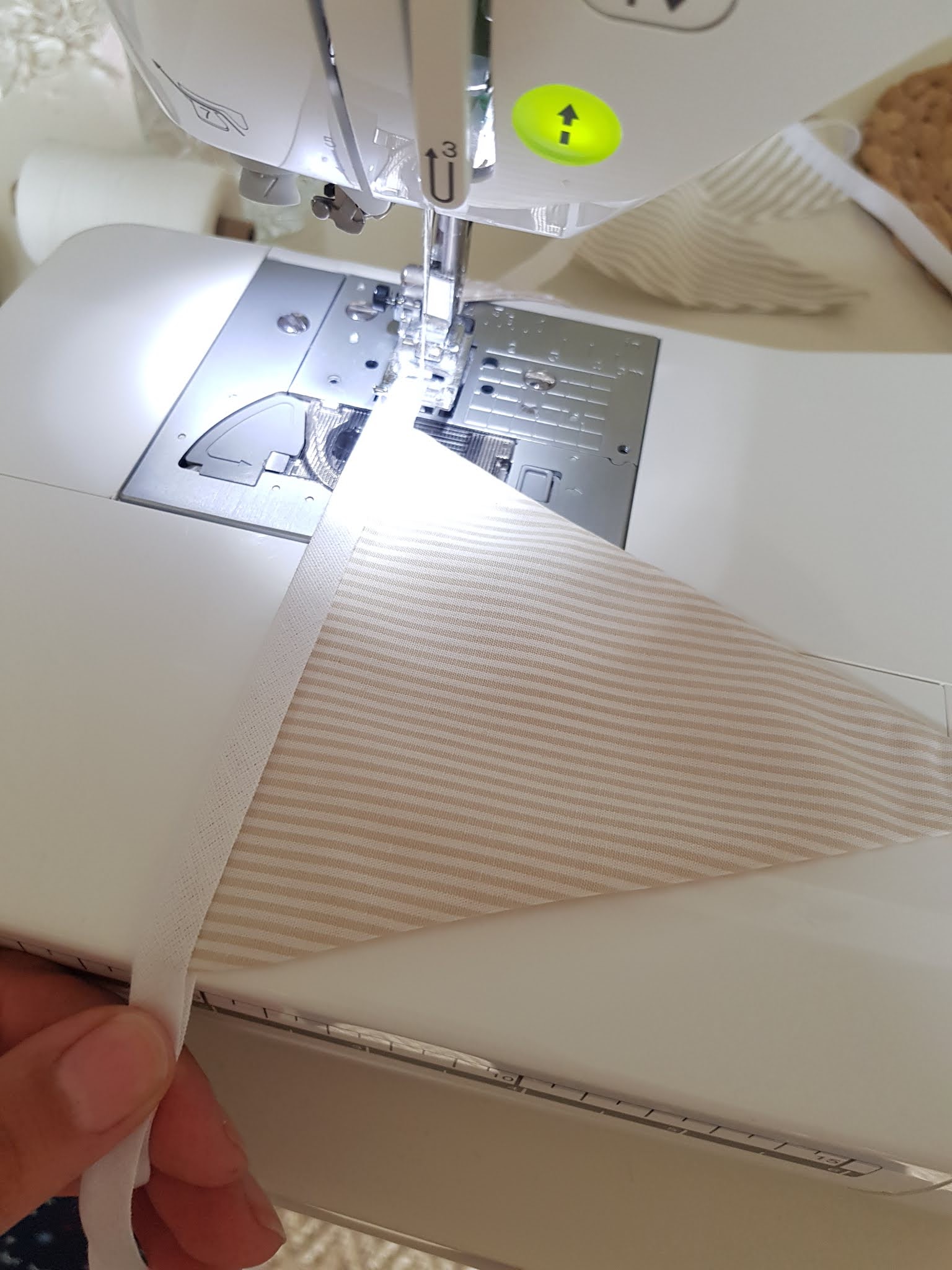 Nach einem Stück könnt ihr damit beginnen die Wimpel dran zu nähen, entweder näht ihr Wimpel direkt an Wimpel oder ihr lasst so wie ich etwas Platz zwischen jedem Wimpel. Um den Wimpel an das Schrägband zu nähen müsst ihr den Wimpel einfach zwischen die beiden Schrägbandseiten legen und festnähen.